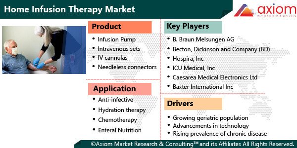 The exclusive COVID 19 impact analysis report by Axiom MRC provides a 360-degree analysis of micro and macro-economic factors on the home infusion therapy market. In addition, complete analysis of changes on home infusion therapy market expenditure, economic and international policies on supply and demand side. The report also studies the impact of pandemic on global economies, international trade, business investments, GDP and marketing strategies of key players present in the market.