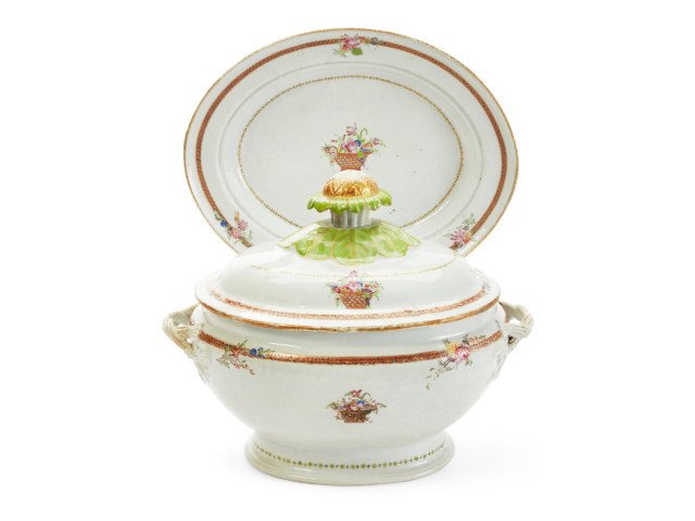 A selection of porcelain and glass features early Chinese Export, as well as five lots of Royal Copenhagen Flora Danica pattern dinnerware, a suite of Baccarat Malmaison pattern stemware (est. $2,500-3,500) and art glass works by Cluthra, D’Argental, Daum Nancy, Quezal, Tiffany Studios, Steuben and Thomas Webb.