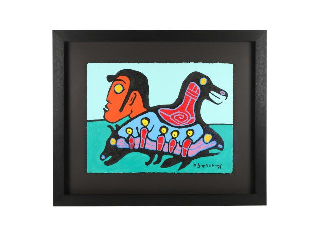 Norval Morrisseau’s Ancestral Visitors (1998) brings together many elements – such as spirits – a continuance of life in the body of one animal while showing a connection to other life and spirit forms. The work is signed lower right and measures 22 inches by 30 inches (sight, less frame), and is expected to find a new home for $12,000-$15,000.