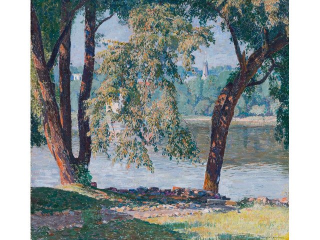 Folinsbee’s, Goat Hill, from 1923, traveled to the 1924 Texas State Fair as part of a loan exhibition of American paintings (est. $40,000-60,000). From another collection, an exceedingly rare, large New Hope school painting by New England artist William Lester Stevens of Point Pleasant on the Delaware River, from circa 1927-1929, measures 42 inches by 48 inches (est. $20,000-$30,000).