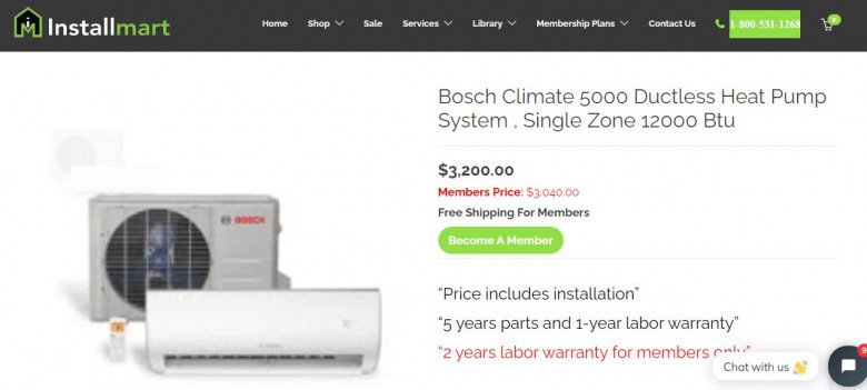 Buy All types of Split Air Conditioners like Split Air Conditioners Bosch Climate 5000 Single Zone 12000 Btu from Installmart Online Store. The price of Split Air Conditioners Bosch Climate 5000 Single Zone 12000 Btu $3200 that reduced to $3040 if client get membership. Call 1-800-531-1268 for Air Conditioners Installation Services, Split Air Conditioners Repairing Services or Split Air Conditioners Replacement Services.