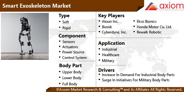 A smart exoskeleton Market is a wearable device that functions as an amplifier to enable humans perform effectively. In a smart exoskeleton, an advanced algorithm is employed to autonomously adapt the exoskeleton in response to body motions. It is used to increase walking endurance, improve athletic performance, and assist a stroke patient in walking again. Smart exoskeletons can now measure energy use by tracking respiration, due to recent technology breakthroughs. The device adjusts dynamics automatically to help reduce human energy expenditure. Outside the body, smart exoskeletons are made up of rigid elements or hardware, such as sensors and actuators, as well as robotic software. Usage of smart exoskeleton aids in preventing injuries in elderly people and people who are suffering from musculoskeletal injuries and neurological disorders